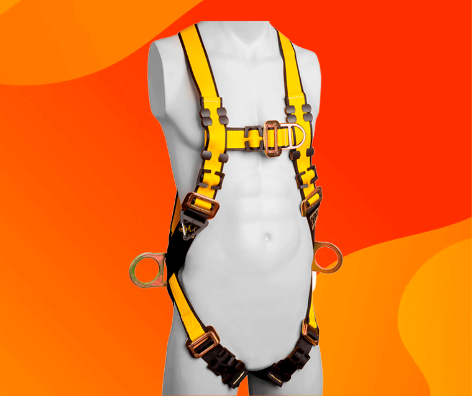 Arnés cuerpo completo, cuatro argollas metalicas fabricado en dos colores, con cinta plana bicolor 45 mm. poliéster (Amarillo/Negro), para facilitar su postura. Cuenta con cierre y regulación en pecho y piernas mediante hebilla de dos piezas de aleación metálica. Las argollas se ubican en: espalda (una argolla D grande), sobre cunta de pecho (una argolla D chica) y ambos costados de la cintura (dos argollas D grandes). La unidad cuenta con fusible/testigo sobre tirantes, que evidencian la detención de una caida.